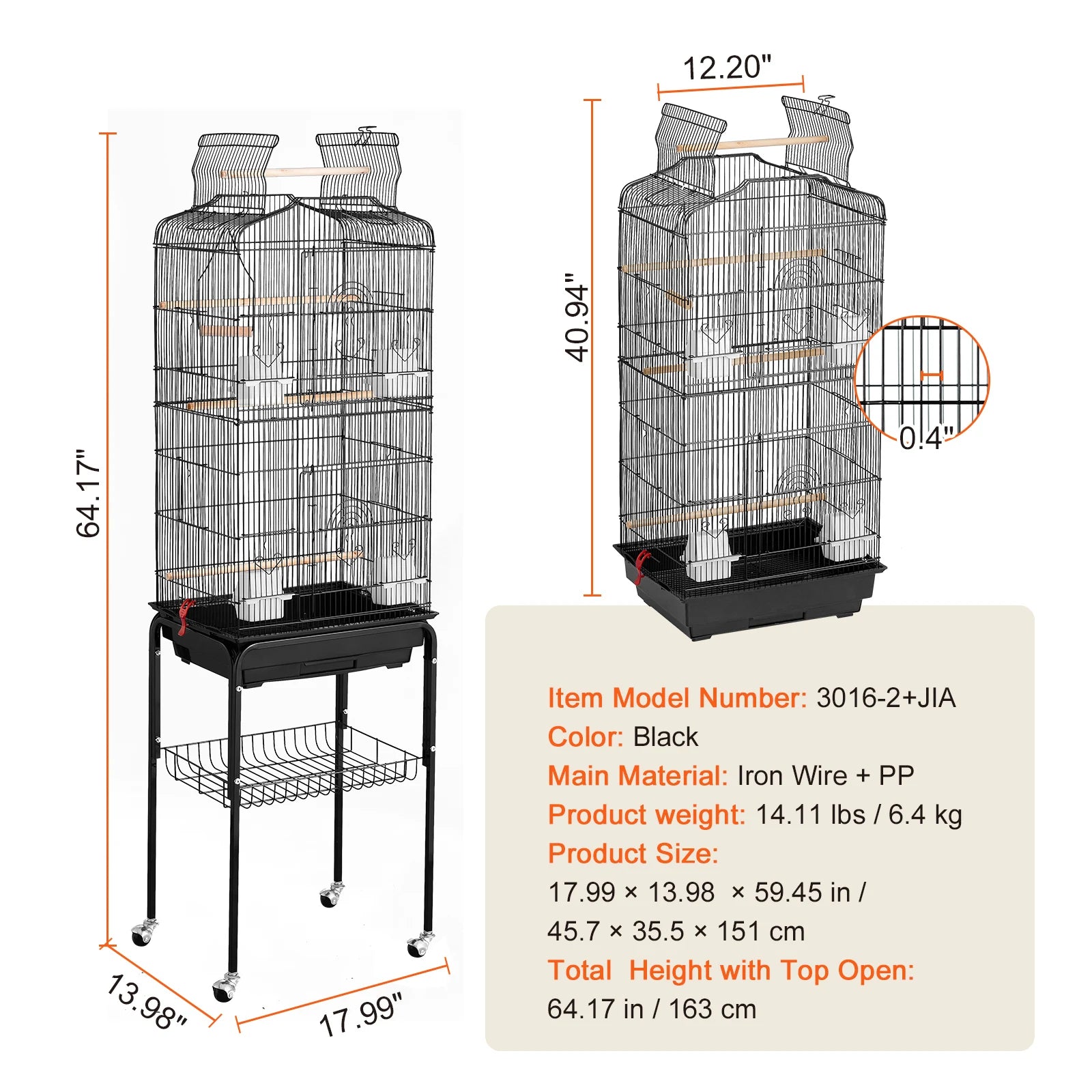 Sturdy Build: Made of premium iron wire and PP material, the parrot cage has a thick wire diameter of 2.6 mm and is coated with anti-corrosive paint.