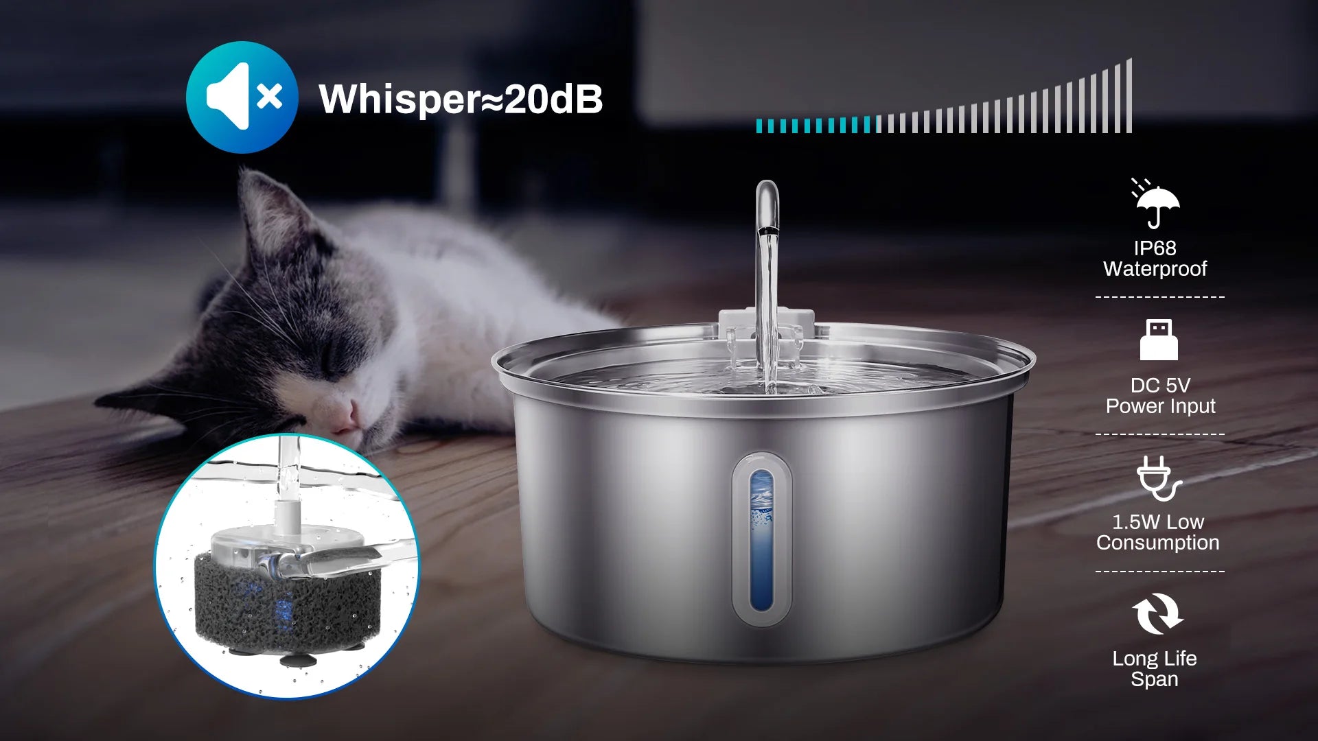 This pet fountain comes with a 1.5W low-power consumption pump that operates super silently, close to 20 dB. Even when it runs at night, it won't disturb your sleep.